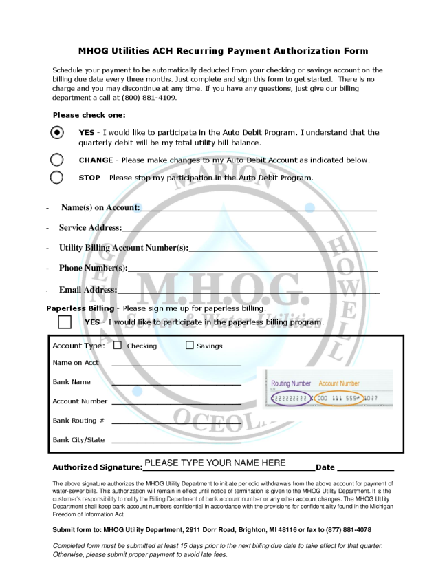 I hereby authorize the lee county utility billing department, hereinafter called utility department, to automatically debit my credit card account for payment of monthly utility bill. #2 provide your signature for authorization i authorize the city of novi to deduct my payment(s) from the checking or savings account listed below. You can use them together to create a full picture of indicate the data use purpose associated with the form, such as billing or marketing. • recurring billing schedule ccd authorization form ‐ variable use this form to authorize a different recurring amount with an open end date. It can take up to a month to set up.